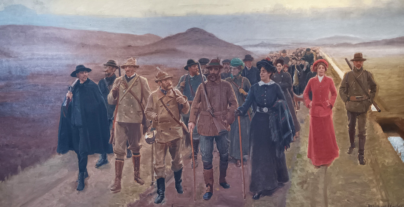 Jægerne lo muntert: „Vi bærer jer over! De tykkeste er vi to om, det skal mageligt gå!“