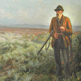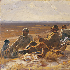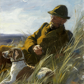 Overplantør C.F. Dahlerup med jagthund, 1898. Forarbejde til "Skagensjægere", AROS Aarhus Kunstmuseum. Olie på lærred. 51,7+92,5. Bet f.o.t.v.: S.K. Skagen, Aug. 98