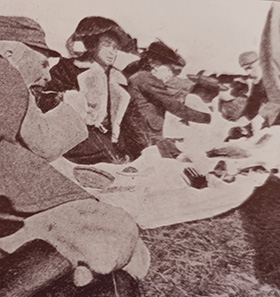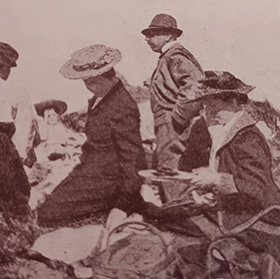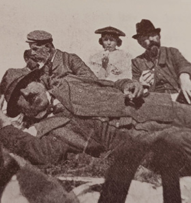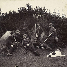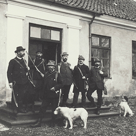 På trappestenen til plantørboligen i Skagen: Fra venstre driftsbestyrer Lundsteen, overplantør C.F. Dahleruop, maleren Michael Ancher, hotelejer Degn Brøndum, toldforvalter Nicolai Frederik Grønenberg og distriktslæge Hans Henrik Brock. Fotos: H.P.F. Lundsteen) |
