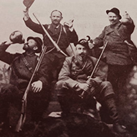 Det er fra venstre driftsbestyrer Lundsteen, overplantør C.F. Dahlerup, maleren Michael Ancher, hotelejer Degn Brøndum, toldforvalter NicolaI Frederik Grønenberg og driftslæge Hans Henrik Brock.