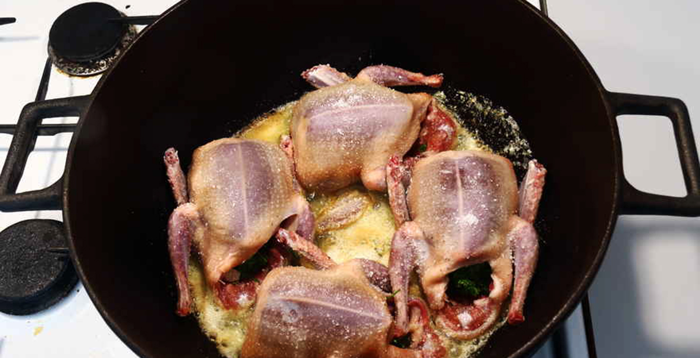 Tag de færdigstegte duer op af gryden og hold dem varme.