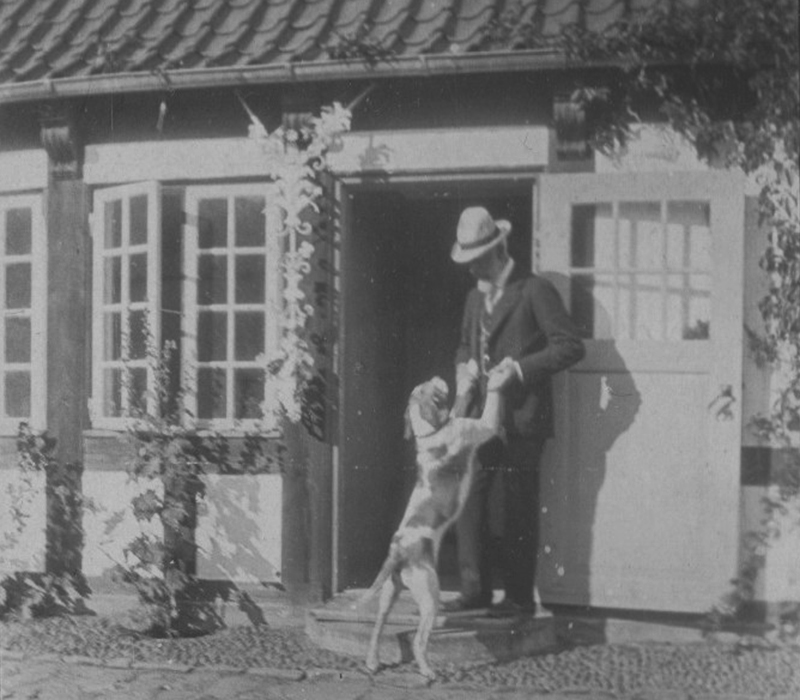 Laurits Tuxen med sin hund på gårdsplads ved Villa Dagminne. Foto fra Laurits Tuxen privat fotoalbum 1902-27.